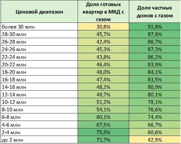 На данный момент на российском рынке недвижимости сложилась ситуация, когда загородные дома, выставленные на продажу чаще газифицированы, чем вторичная недвижимость, находящаяся в многоквартирных домах (МКД). Среди частных домов и таунхаусов доля с подведенными газовыми коммуникациями достигла 71%, а на рынке вторичной недвижимости в МКД – 63,4%.