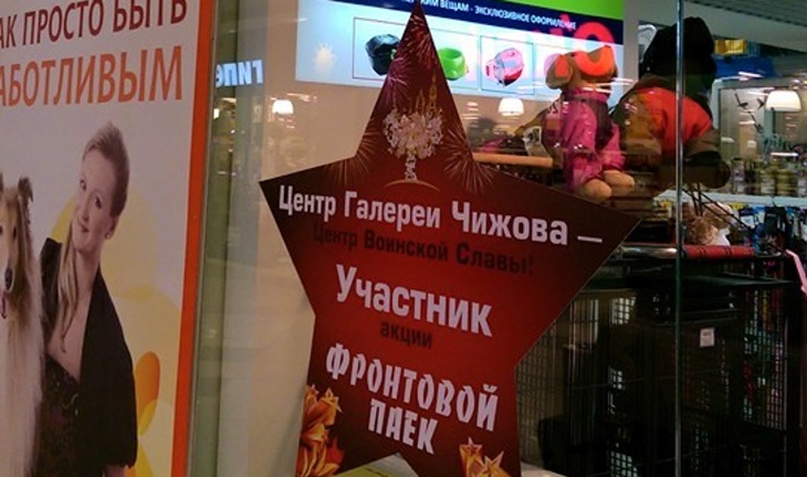 Например, что может подумать наблюдатель, которому зоомагазин сообщает, что он является «участником акции» фронтовой паёк для ветерана? Такой аншлаг в виде звезды с шапкой «Центр Галерея Чижова» появился на днях на витрине, где продаётся корм животных и прочие собачьи радости.