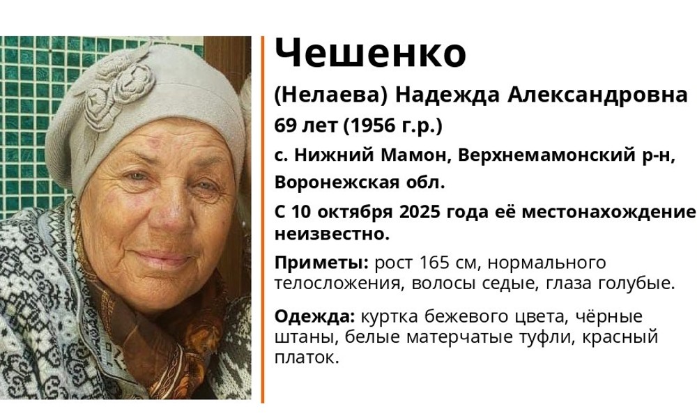 Проходят поиски 69-летней Надежды Александровны Чешенко (Нелаевой) из Верхнемамонского района. Женщина ушла из дома в селе Нижний Мамон утром 10 октября и до сих пор не вернулась. Об этом сообщили в поисковом отряде «ЛизаАлерт» Воронежской области.