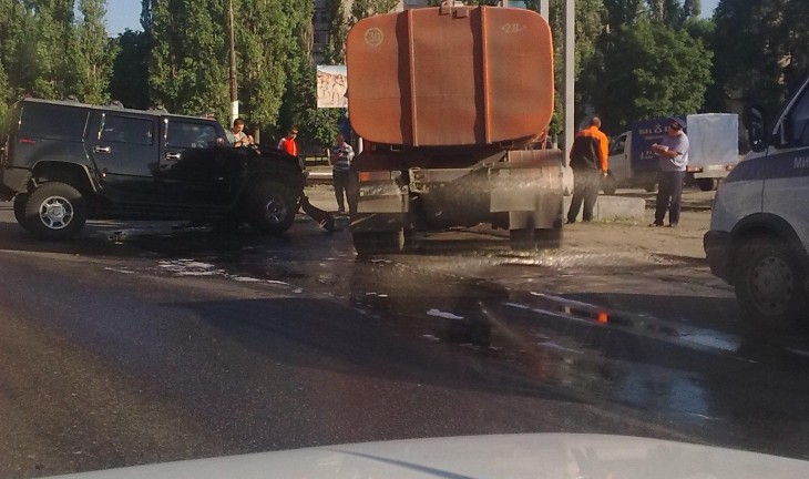 Сегодня, 11 июня, ранним утром у ТЦ "Армада" произошла серьезная авария - черный внедорожник марки Hummer столкнулся с поливальной машиной КАМАЗ, убиравшей дорогу. Удар был такой силы, что КАМАЗ отбросило в сторону на несколько метров, и он врезался в столб рекламного щита.