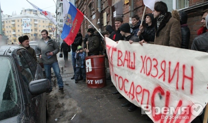 В пятницу, 15 марта, у Дома прав человека в Воронеже выстроилась группа молодых людей с красными металлическими баками и транспарантами «МПГ, МХГ, МПД, ЛГБТ, ваш хозяин Госдеп США». Парни и девушки размахивая флагами скандировали лозунг «Янки, гоу хоум!».