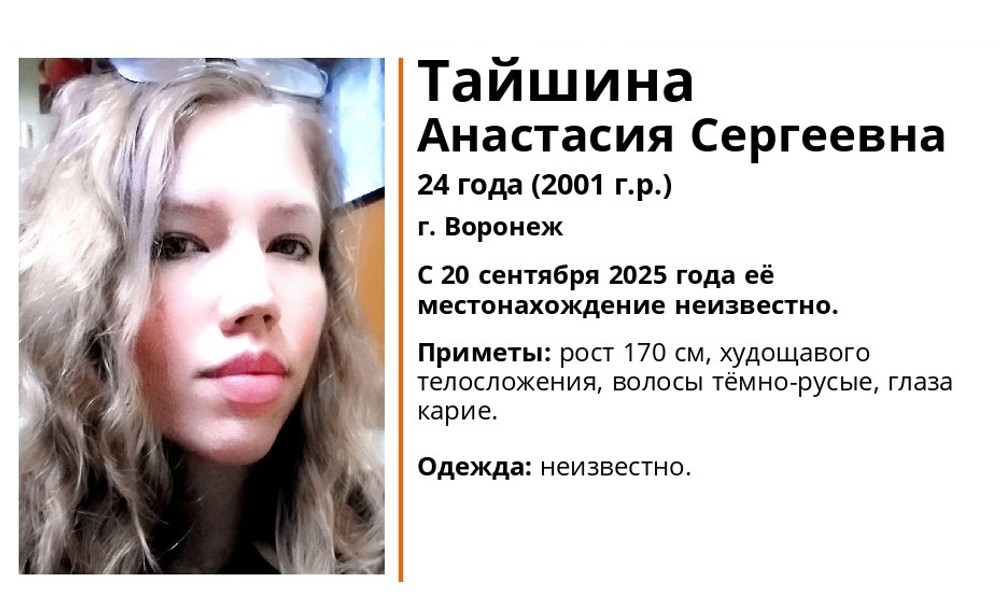 Разыскивается 24-летняя жительница Воронежа – Анастасия Сергеевна Тайшина. С 20 сентября 2025 года её местонахождение остаётся неизвестным.