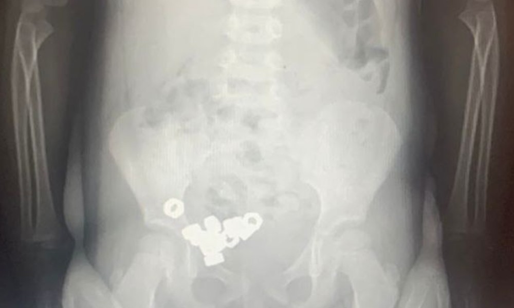 Родители привезли ребёнка в приёмное отделение, заподозрив, что он мог проглотить что-то постороннее. Симптомов не было, малыш чувствовал себя спокойно, но врачи сразу направили его на рентген. Снимок показал десятки чётких контуров металлических предметов – в желудке и кишечнике находилось 16 гаек.