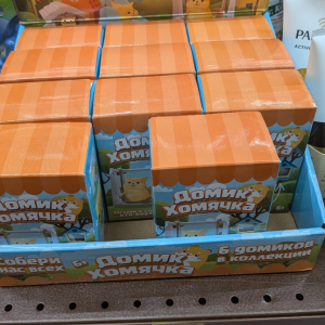 Игрушки визитная карточка сети. В ассортименте без ажиотажа, с характером. Коробочка «домик хомячка» за 69 рублей предлагает один из шести вариантов жилища для грызуна (сюрприз внутри). Рядом коробки с дракончиками за 39 рублей. По картинке на упаковке похоже на качественный пластик, не «киндер», для коллекции пойдет.